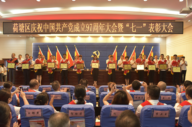 7月2日,荷塘区召开庆祝中国共产党成立97周年暨七一表彰大会,动员和激励全区各级党组织和广大党员干部,继承和发扬党的优良传统,切实加强党的建设,为全区经济社会发展提供坚强保障。全体在职县级领导,受表彰的先进个人和党组织,行业系统党(工)委书记及分管副职,区直部门和市直分支机构主要负责人,镇(街道、管委会)党政负责人、副书记及组织委员,村(社区)党组织书记参加会议。