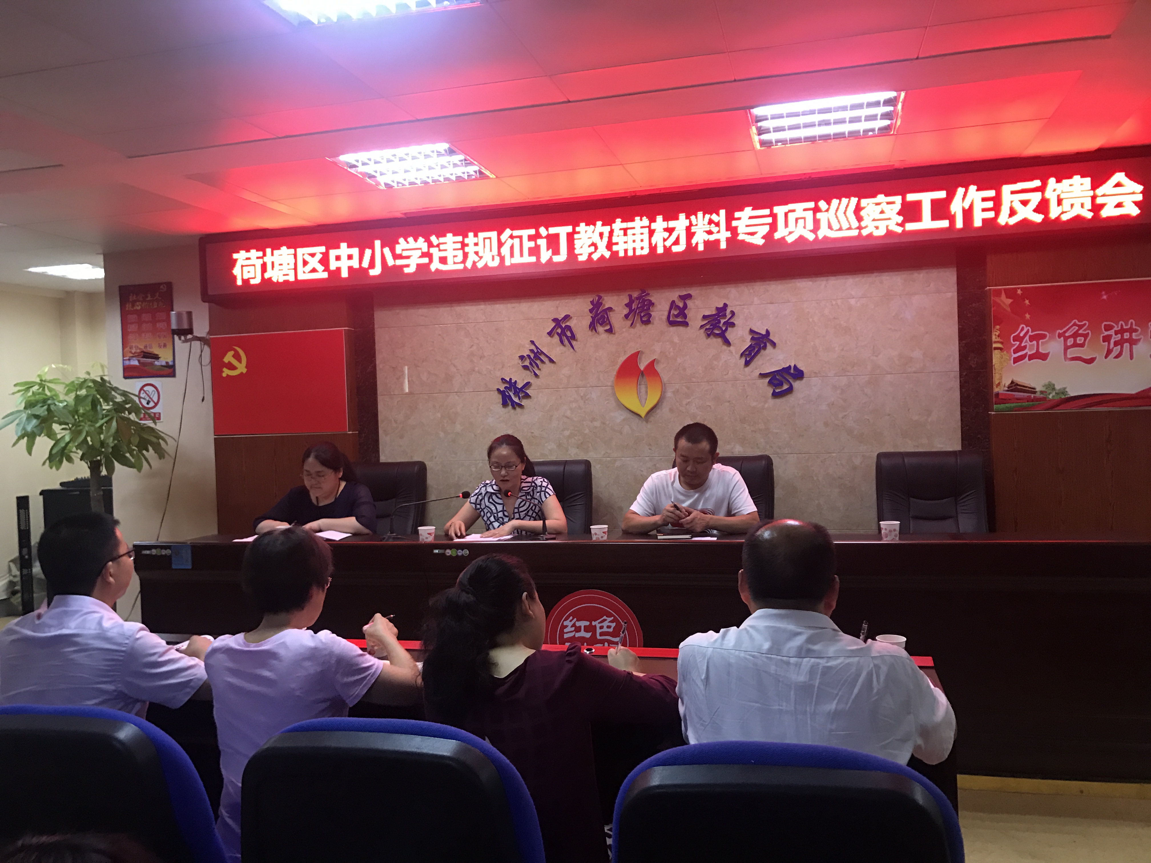 7月5日下午,区委第四巡察组在区教育局召开“荷塘区中小学违规征订教辅材料”专项巡察工作情况反馈会。第四巡察组全体成员、教育局全体班子成员、被巡察中小学党(总)支部书记、校长参加会议。