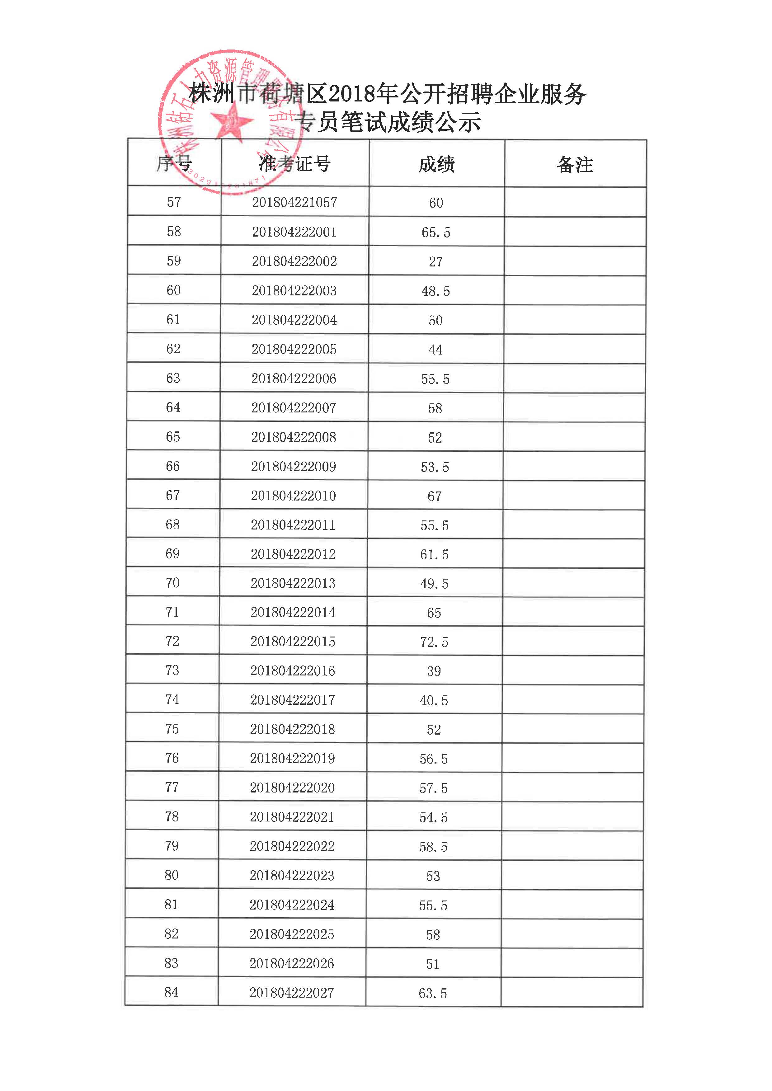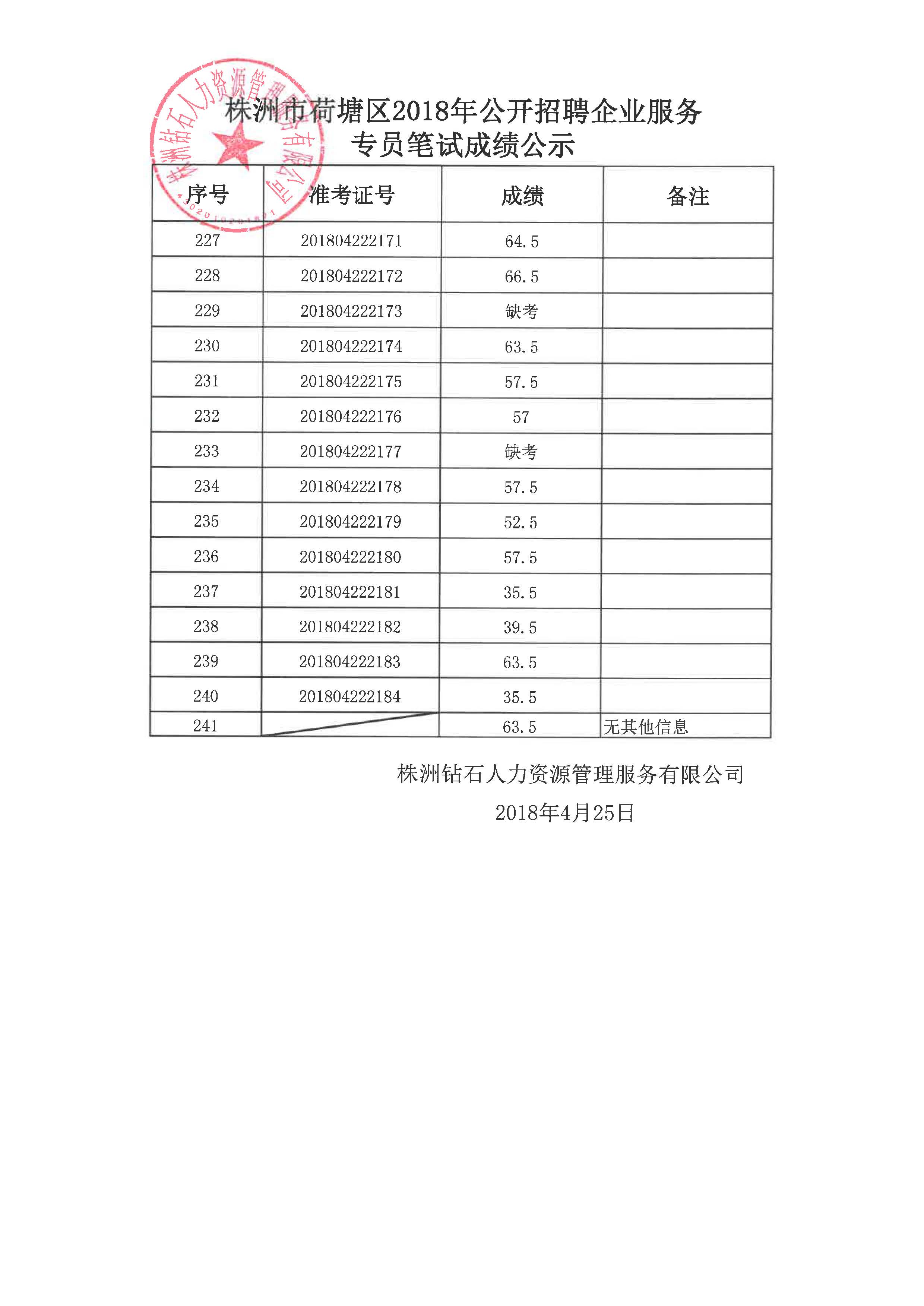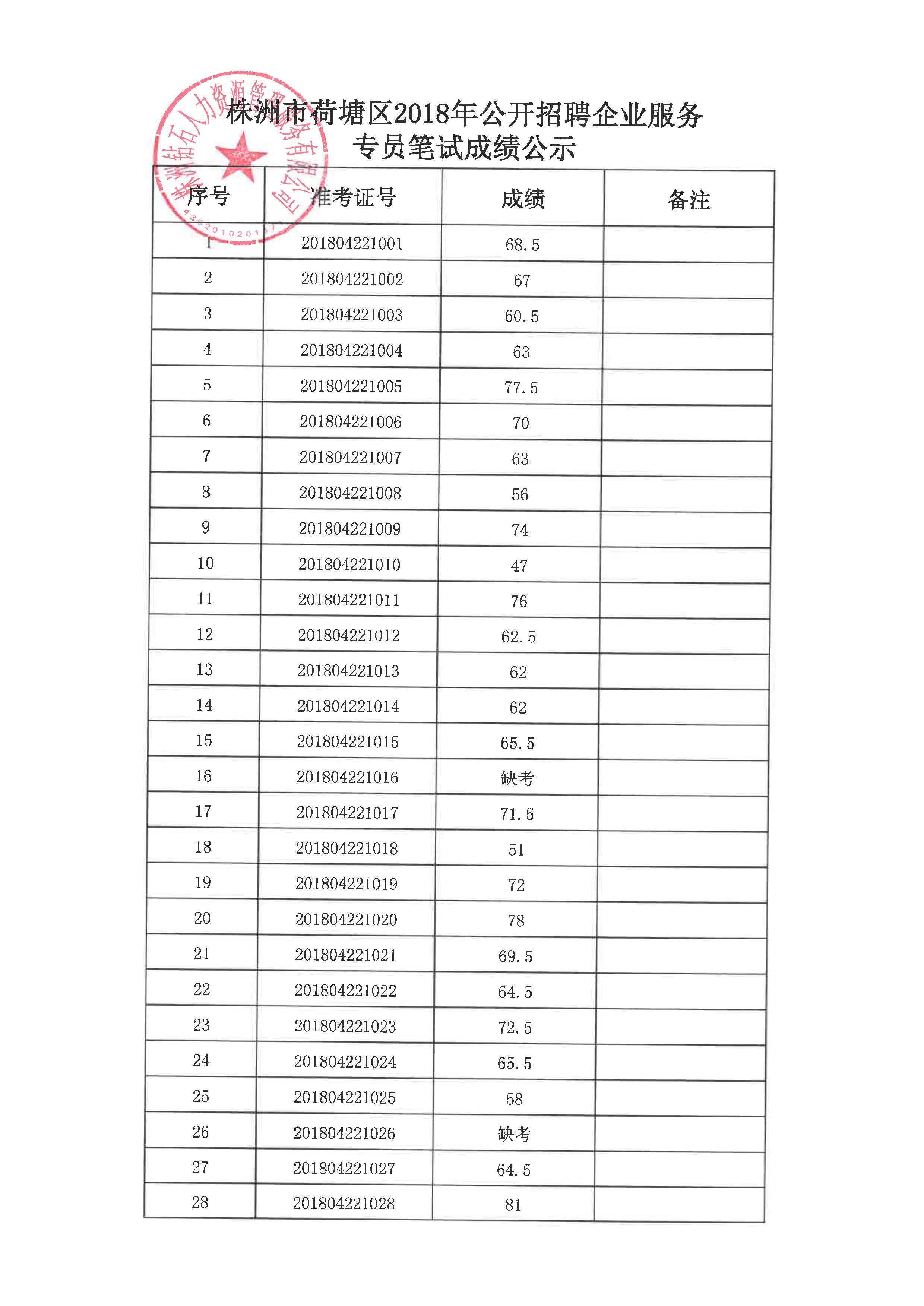 根据《2018年荷塘区企业服务专员招聘公告》(2018年4月12日发布),经公开报名、资格审核,株洲钻石人力资源管理服务有限公司于4月22日组织符合职位条件的考生进行了笔试,现将笔试成绩予以公示。