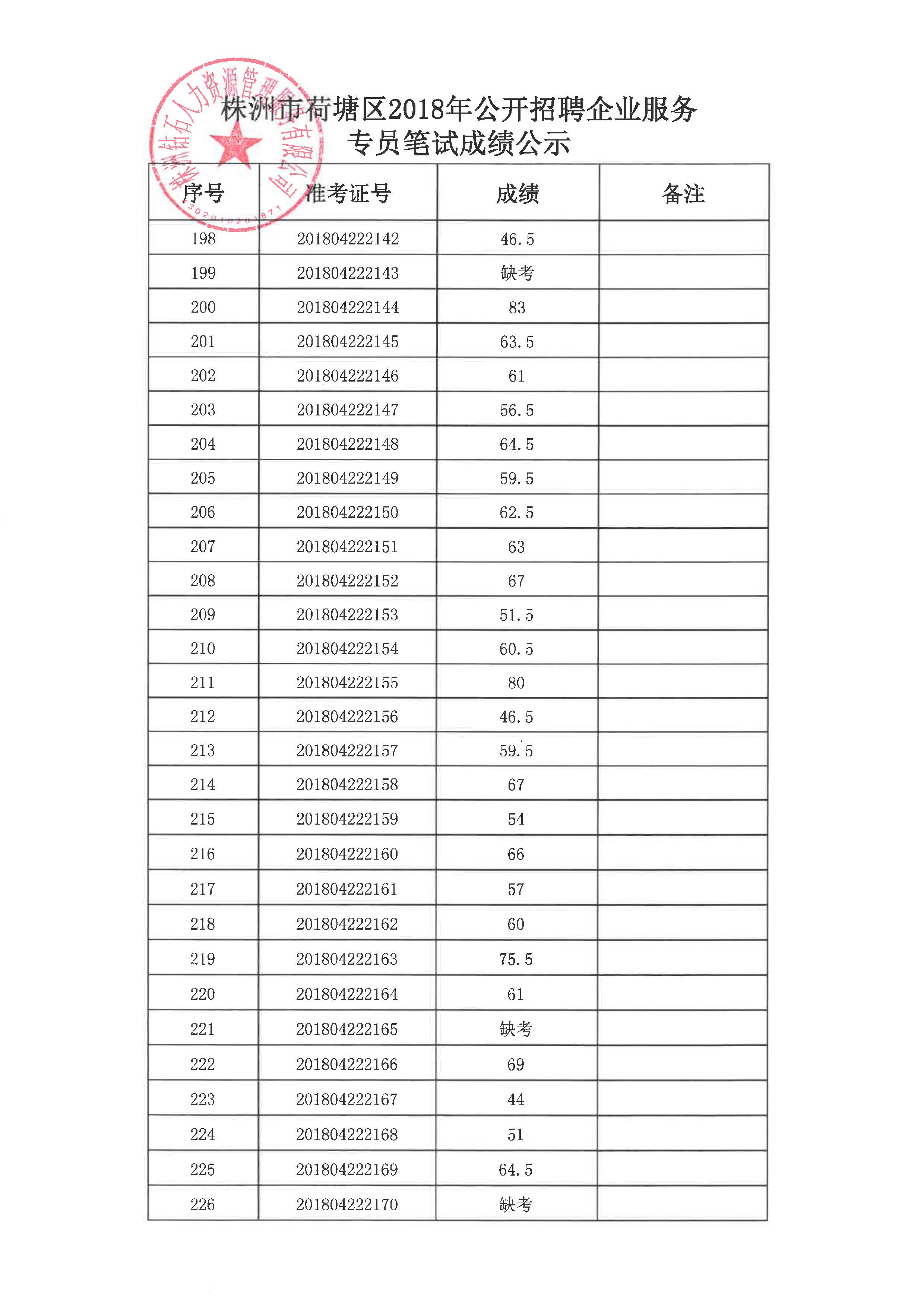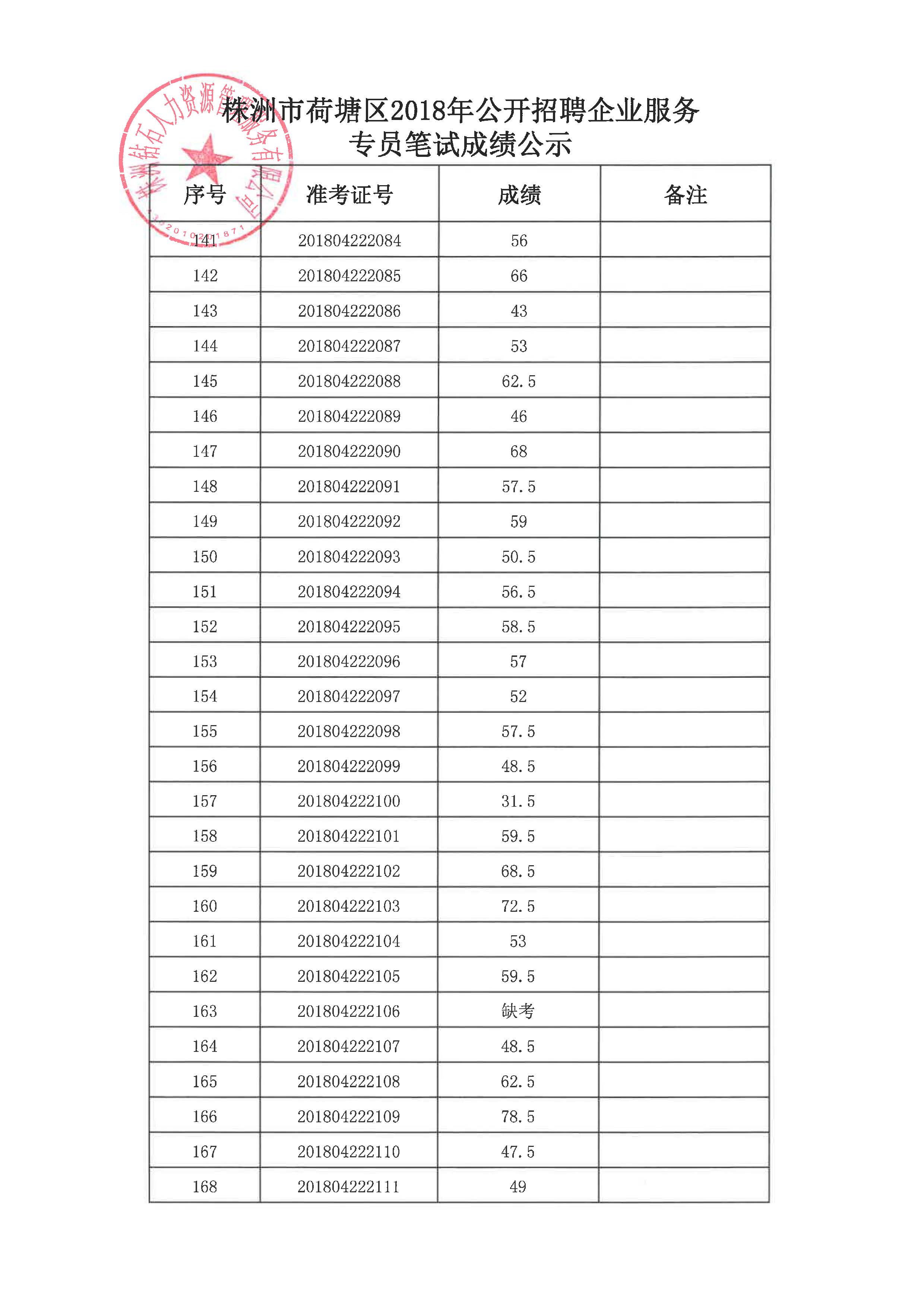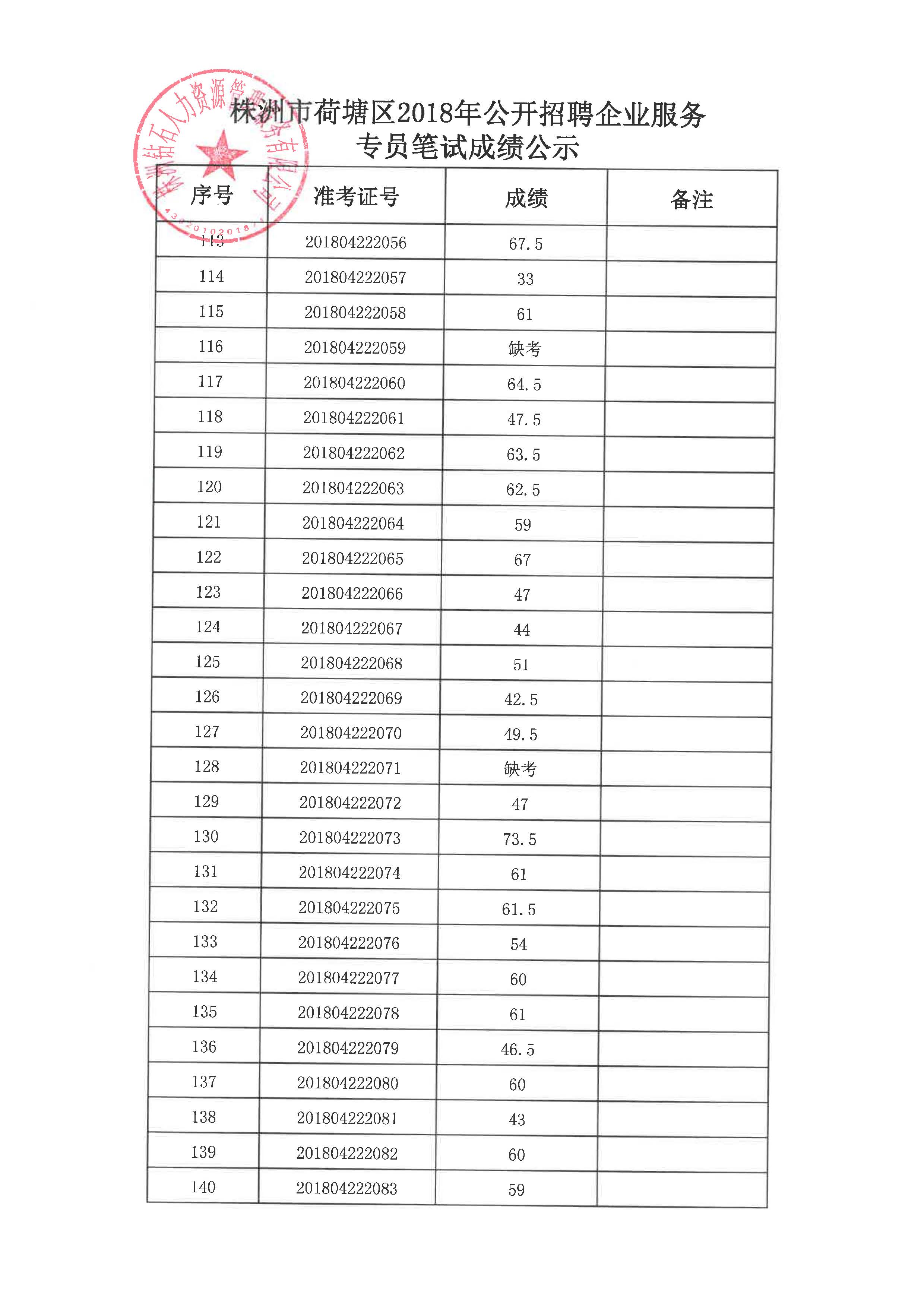 根据《2018年荷塘区企业服务专员招聘公告》(2018年4月12日发布),经公开报名、资格审核,株洲钻石人力资源管理服务有限公司于4月22日组织符合职位条件的考生进行了笔试,现将笔试成绩予以公示。